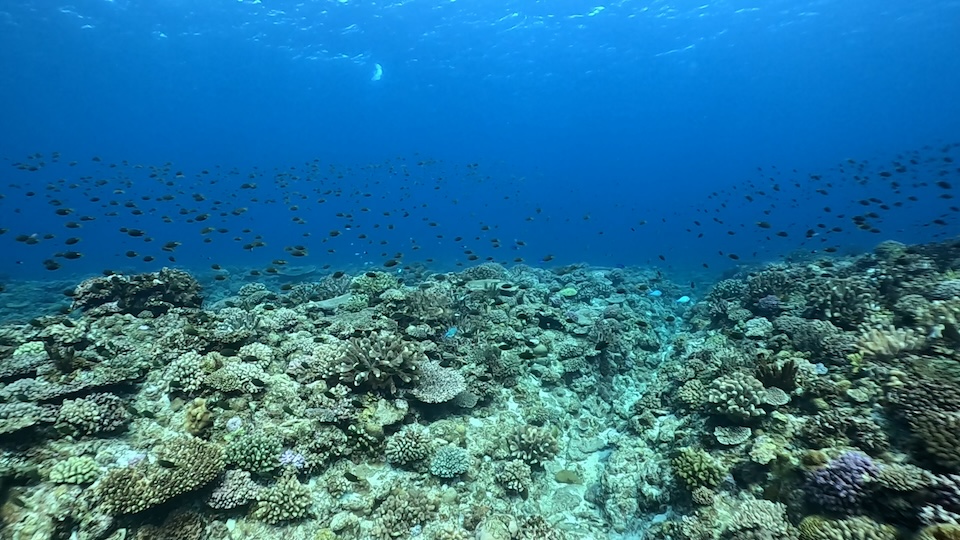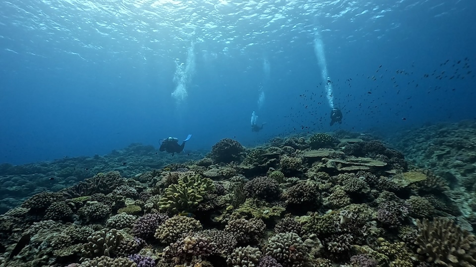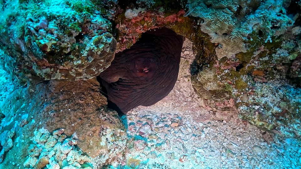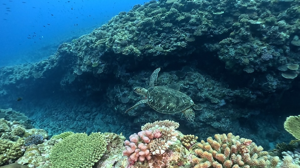 そして2本目はクレーターというポイントへ移動。月のクレーターのような形状の穴が水中にいくつかある不思議なポイントです。透明度がさらに増しており、浅瀬の珊瑚は生き生きと美しかったです。先ほどのアカウミガメに引き続き、ここではアオウミガメと出会うことができました。5匹のナンヨウハギ(ドリー)に囲まれて、まさにディズニー映画のような世界を楽しみました。